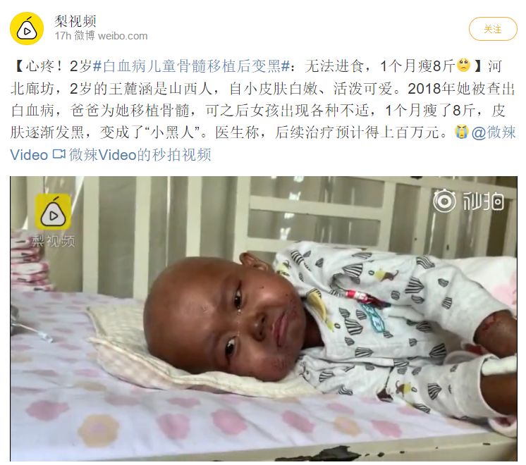 2岁的王麓涵2018年被查出白血病,今年2月,爸爸为她移植骨髓,可之后女孩出现各种不适,1个月瘦了8斤,皮肤逐渐发黑,变成了“小黑人”。