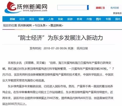 感谢发达的网络,很快就查到了信息:2018年7月28日,江西抚州新闻网发表的一篇《 “院士经济” 为东乡发展注入新动力》的文章 [1]。从这里我知道了这个院士工作站是和江西东华种畜禽有限公司(以下简称东华公司)和中国科学院院士、中国农业大学吴常信教授合作建立的。而东华公司的养殖基地,就建在我老家的这个山村里。