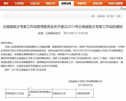 例如,2017年9月,楚雄彝族自治州的科学技术局的网站上发布了云南省批准了60个院士工作站的信息 [3],其中之一就是由吴常信院士和云南大理鸡鸣江种鸡公司合建的。这个种鸡公司位于云南省大理白族自治州大理市凤仪镇创新工业园里,也同样是一个偏僻的所在。