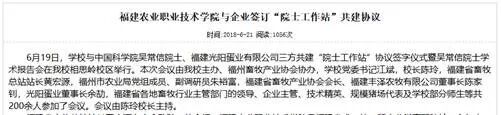 2018年6月21日,福建农业职业技术学院的网站发布福建农业职业技术学院与企业签订 “院士工作站” 共建协议》的新闻 [9],报道了2018年6月19日福建农业职业技术学院、福建光阳蛋业有限公司以及中国科学院吴常信院士三方共建 “院士工作站” 协议签字仪式的事情。