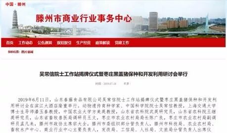 2019年7月18日,山东滕州政府的官方网站发布了一条新闻:《吴常信院士工作站揭牌仪式暨枣庄黑盖猪保种和开发利用研讨会举行》[10]。从这个新闻我们知道,2019年6月11日,吴常信教授又与山东春藤食品有限公司合建了一个院士工作站。