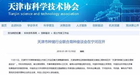 2018年1月9日,天津科学技术协会的网站上发布《天津市种猪行业联合育种座谈会在宁河召开》的新闻 [4]。该新闻报道的是2017年11月11日天津宁河原种猪场的院士工作站召开专家座谈会的事情,该工作站的院士依然是吴常信。作为这个工作站的建立者,吴院士参加这这个座谈会并发言。