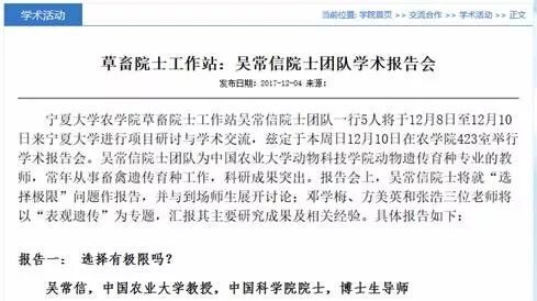 在2017年12月4日宁夏大学农学院发布的新闻《草畜院士工作站:吴常信院士团队学术报告会》里 [5],我们可以知道吴院士在宁夏大学农学院也建立了一个草畜院士工作站,而且他本人和他带领的团队将于2017年12月8日到这个工作站做学术报告。