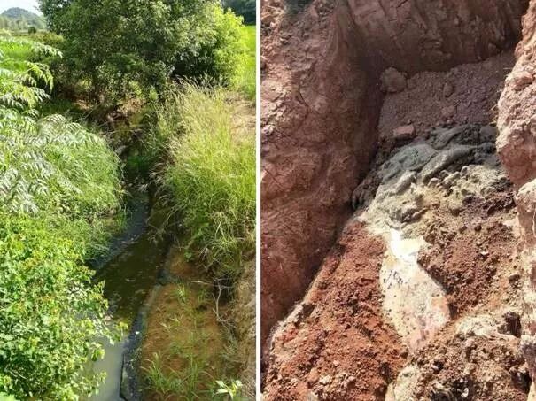 除了养鸡,东华公司还养猪。养猪的废水没有处理就直接排入了河流,不仅把老家村里唯一的小河变了颜色,也变了气味(下图左)。今年养猪场爆发非洲猪瘟,东华公司也没有按要求进行处理死猪,而是在没有经过村民同意的情况下直接在山上挖坑掩埋(下图右)。