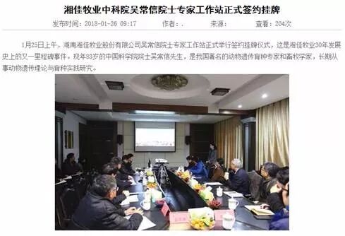 2018年1月26日,牧通人才网发表了《湘佳牧业中科院吴常信院士专家工作站正式签约挂牌》的文章 [6]。从这篇文章里我们可以了解到,2018年1月25日上午,湖南常德湘佳牧业股份有限公司和吴常信院士共建的专家工作站正式举行签约挂牌仪式,吴院士本人亲自到场。