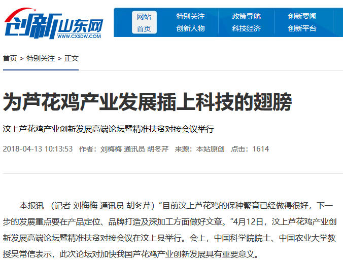 2018年4月13日,创新山东网发布了一条《为芦花鸡产业发展插上科技的翅膀》的新闻 [8]。根据这条新闻我们知道,2018年4月12日吴院士到山东省汶上县参加了一个创新发展高端论坛,并在在会上做了报告;而且会议期间他还和当地的山东金秋农牧科技有限公司签订了院士工作站建设协议。