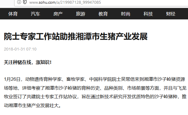 2018年1月31日,搜狐发布的一则《院士专家工作站助推湘潭市生猪产业发展里》的新闻 [7]。在这则新闻的开头有这样的描述: “1月26日,动物遗传育种学家、畜牧学家、中国科学院院士吴常信来到湘潭市沙子岭猪资源场等地,详细考察了湘潭市沙子岭猪的育种历史、品种类别、市场前景等方面,并且与飞龙牧业签订了共建院士专家工作站协议,旨在通过新技术研究开发优质特色的沙子岭猪种,推动湘潭市生猪产业发展壮大。”