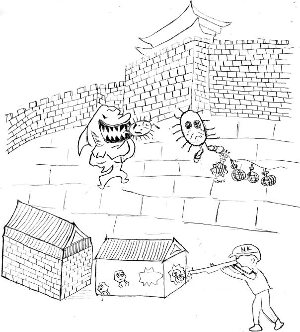 中性粒细胞是一些更加专业和恐怖的绞肉机。首先,它们的数量巨大,一个成年人体内每天会产生数十亿计的中性粒细胞。其次,它们平均寿命最多就是几天,而一旦从血液里冲锋到组织里后,它们的寿命就只能用小时来计算了。所以它们是一群天生就不要命的家伙,在和我们斗争的时候是以死相拼的。而且,中性粒细胞身上配有更为厉害的武器,比如它能产生更多的活性氧和溶菌酶,甚至它们在死的那一刻还会编织出一个网状的东西把我们逮住。所以,这些装备良好又不要命的家伙才是可怕的杀手。除了召集中性粒细胞到来外,巨噬细胞还会分泌其它多种细胞因子。这些细胞因子就像战场上的信号灯,能指挥免疫系统的行动。比如有些细胞因子负责产生凝血因子把局部的血管封闭,从而把我们限定在局部区域进行打击,就是人类所谓的“关门打狗”的战术。再比如有些细胞因子是调节体温的,通过升高体温,也就是人类说的发烧,来限制我们的生存。即使是低烧对我们也是很麻烦的事情,因为会严重干扰我们的正常生活和繁衍。对人类来说,发烧其实也是一个“杀敌一百,自伤三十”的策略。因为它也会干扰正常人自身细胞的功能,从而让他们自己也很不舒服。我们听说有些人是很不喜欢发烧的,稍微有点低烧就赶紧用退烧药。听到这些我们当然是偷着乐了,因为退烧对我们是有好处的。至于对人类有没有好处,我们就不告诉他们了,嘿嘿。上面说的是在细胞外生活的兄弟们进入城墙后的遭遇,现在来说说我们那些生活在细胞内的兄弟。因为我们这些兄弟习惯在人类的细胞内生活,所以那些补体连环炸弹一般是炸不到它们的。另外,因为它们有一套在细胞内生存的本领,巨噬细胞即使吃掉它们也拿它们没有什么办法。比如说我们的病毒兄弟,它们可能直接进入到皮肤或粘膜的上皮细胞里,那么补体这样的连环炸弹和巨噬细胞这样的绞肉机就拿它们就没有办法了。但是,躲到细胞里面却不意味着它们就安全了,因为另外一些可怕的武器早就在那里等候着它们呢。一方面,被病毒侵入的上皮细胞会合成一种叫干扰素的东西,能干扰病毒的繁殖。另一方面,被侵入的上皮细胞还会分泌出一些特殊的细胞因子,向外界发出信号,召唤天然杀伤细胞的到来。顾名思义,天然杀伤细胞就是天然存在的杀手,它们通常在血液里流动巡逻,当发现危险信号时就会迅速赶到现场,打击感染了病毒的细胞。或许您会问了,那天然杀伤细胞是如何区分细胞是否感染了病毒呢?这的确是个好问题,因为如果不解决这个问题,这个杀手就要滥杀无辜了。其实原理挺简单,在一般正常人类细胞的表面有一种叫MHC一类分子的蛋白,这个分子能阻止天然杀伤细胞攻击。而在感染了病毒的细胞上,这个MHC一类分子会发生变化,从而对天然杀伤细胞不再有抑制作用。说到这里或许您又会说了:“你们病毒兄弟为什么就那样笨啊,让那些细胞的MHC一类分子保持原样不就安全了么?”我们的病毒兄弟当然没有那样笨,原因是如果让那些MHC一类分子保持原样,它们将迎来更厉害的攻击。这是后话,我们在此暂且不提。天然杀伤细胞不仅能直接秒杀被病毒感染过的细胞,还能帮助巨噬细胞杀伤一些我们生活在细胞内的兄弟。比如结核杆菌,它能进入巨噬细胞并在那里好好地活着。当巨噬细胞拿它没有办法的时候,就会向天然杀伤细胞发出求助信号。然后这个杀手就会很快来到这些巨噬细胞身边,为它们提供强有力的支持,巨噬细胞对结核杆菌的杀伤力就会大大增加。这就是我们兄弟在攻城墙后的遭遇。您也看到了,无论我们兄弟是生活在细胞外还是躲进了细胞内,都会遭到免疫系统的埋伏和攻击。机关重重的城墙,再加上城墙内的埋伏,都是被人类称为“天然免疫系统”的一部分。虽然这个天然免疫系统杀害了我们不少兄弟,但我们依然要艰难地继续前行。