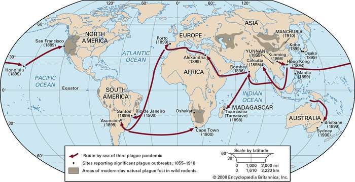 第三次世界大规模鼠疫疫情的传播图(图片来源:Encyclopædia Britannica, Inc.)
