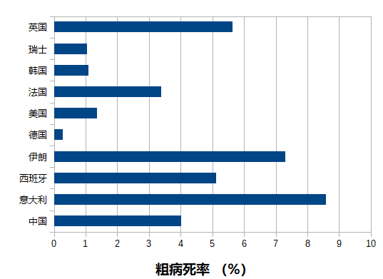 中国的粗病死率为4%,大约相当于全世界的平均值。粗病死率最高的是意大利(9.0%),其次是伊朗(7.55%),较低的是韩国和瑞士(均为1.16%),而最低的是德国,只有0.38%。
