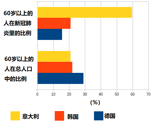 在全国总人口层面,德国老年人的比例最高,全国60岁以上的老人的比例为29%;而韩国和意大利大抵相当,分别为22.1%和21%。但在新冠肺炎病人里的老年人的比例上,德国只有15.5%, 韩国是21%, 而意大利则高达59% [2]。