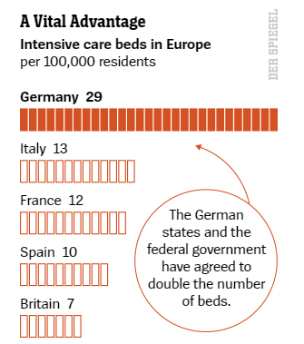 在换算成人均ICU床位数后,德国每十万人口的ICU床位数是29张,而意大利、法国、西班牙、英国所相应得数字分别是:13、12、10、7,德国遥遥领先于它的欧洲邻居们 [6]。