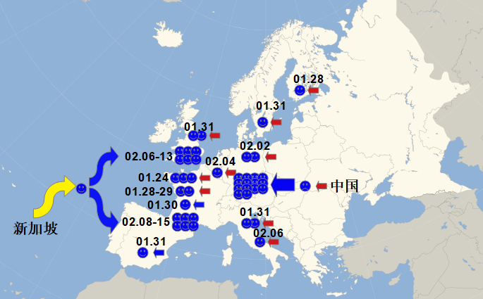 2020年2月19日之前的欧洲新冠肺炎疫情图 (作图:商周,数据来源:参考链接3)。图中一个人脸代表一个病例,红色箭头代表从中国的输出病例,黄色箭头代表新加坡的输出病例,蓝色箭头代表欧洲本地的社区传染病例,数字代表日期。
