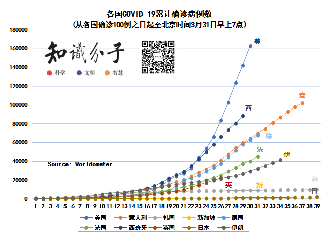 上图是新冠肺炎在世界上几个主要国家的疫情走势图(中国没有包括进去因为疫情现已基本平息不好比较),为了让彼此可以比较,把各国的曲线的起点都设定在该国的第100个病例的那一天。