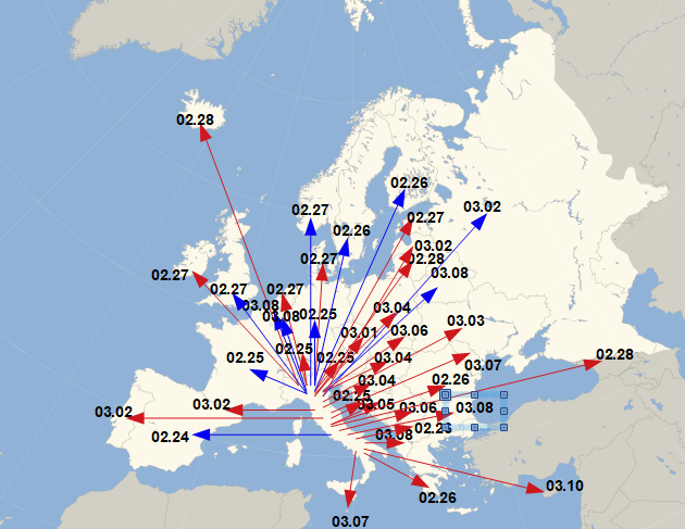 我把意大利向欧洲各国输出病例的情况做成了上面的图,图中的红色箭头代表意大利输出的是目标国的第一个病例,蓝色箭头代表输出的不是目标国第一例病例,数字代表的是输出时间。