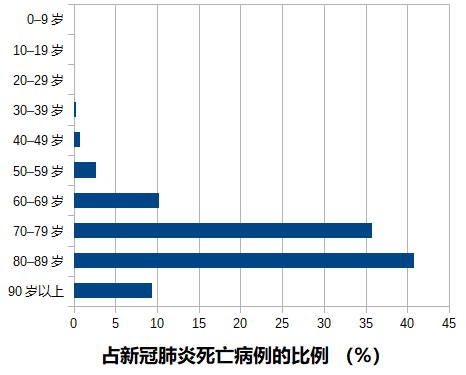 从上图我们可以看到,在意大利新冠肺炎的死亡患者里,60-69岁的占10.2%,70-79岁的占35.8%,80-89岁的占40.8%,而90岁以上的占9.4% [9]。