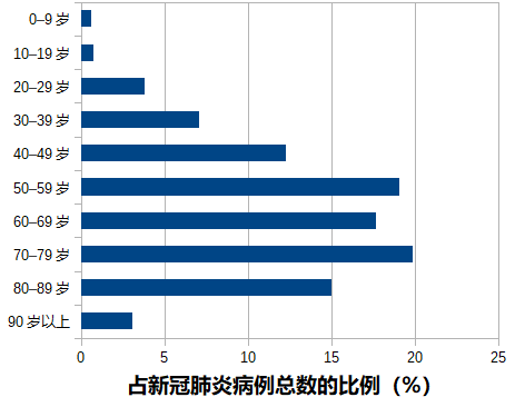如上图所示,在意大利的新冠肺炎患者里,60-69岁占17.7%,70-79岁的患者占19.9%,80-89岁的患者也达到了15%,就是90岁以上的患者也有3.1% [9]。