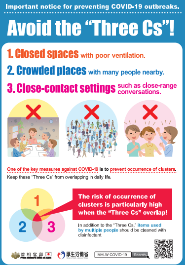 至于日本,政府也在努力防止聚集感染的发生。比如,通过流行病学的调查,日本科学家发现新冠的聚集传染通常是发生在下面几种环境里:1.封闭通风不良的空间(Closed space);2.人群拥挤的地方(Crowded places);3. 密切接触的情形(Colse-contact settings)。于是,政府卫生部门给百姓传递了这个预防新冠感染的 “远离3C” 的理念 [3]。