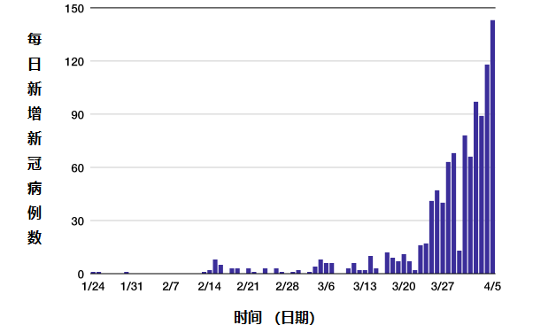 在东京地区,3月25日之前每日新增病例数从来没有达到过20以上,但在之后便剧烈增加,到4月5日更是一天增加了近150例 [5]。