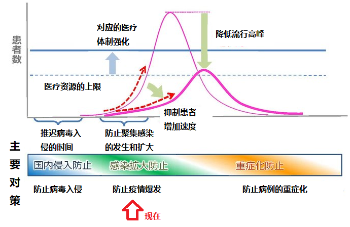 上图是日本的防疫基本对策。我们可以看到,在疫情的不同阶段有着不同的任务。在疫情开始阶段主要的任务是防止病毒的入侵,从2月底到现在的主要任务则是防止疫情的扩大和暴发,而将来则是要防止重症和死亡的发生。