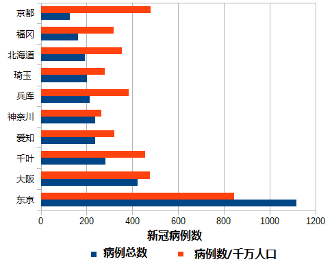 从图中我们可以看到,无论是总病例数还是经过人口校正之后的病例数,东京都排在首位,总病例数已经超过了1000,每千万人口例的病例数也超过了800例。在随后的9个县市,每千万人口的病例数都在200到500之间 [4]。