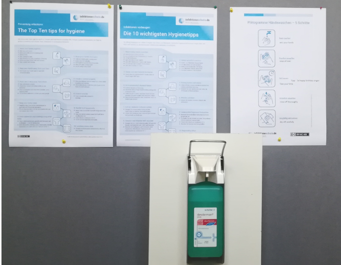研究中心在进门的地方贴着防疫个人卫生指南,并在旁边贴心地配了一瓶消毒液。