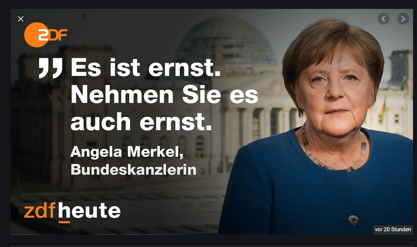 3月18日星期三晚上,德国总理默克尔通过电视向国民发表了讲话。她说,现在疫情非常严重而且还将进一步恶化,并认为这是自二战以来德国所遇到的最大的挑战,呼吁德国国民严肃对待。