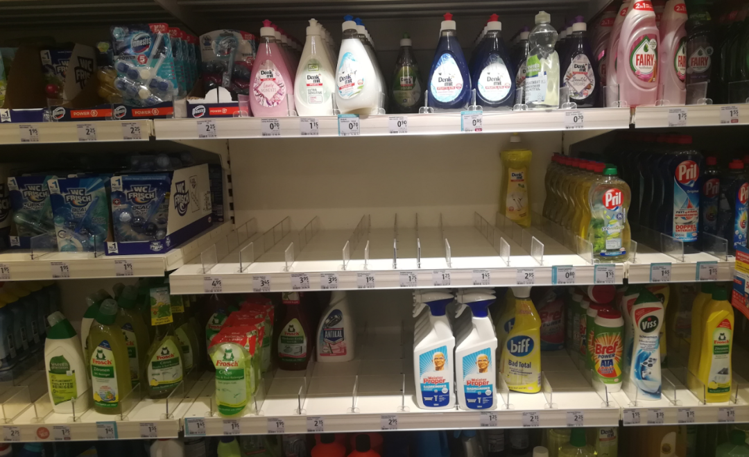 可是,德国已经买不到口罩,而且公众场合也没有人戴。逐渐上升的病例数字让德国百姓感到了紧张。和中国在疫情期间口罩脱销稍微不同,德国百姓抢购的是消毒液。