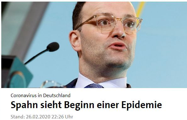 2月26日,星期三,德国卫生部长施潘在晚上突然在发出了预警,说新冠即将在德国暴发。