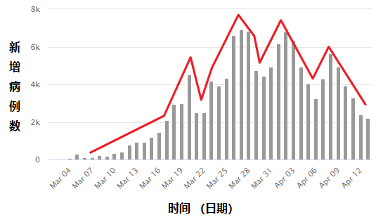 4月13日,星期一,新增病例数2218, 持续下降
