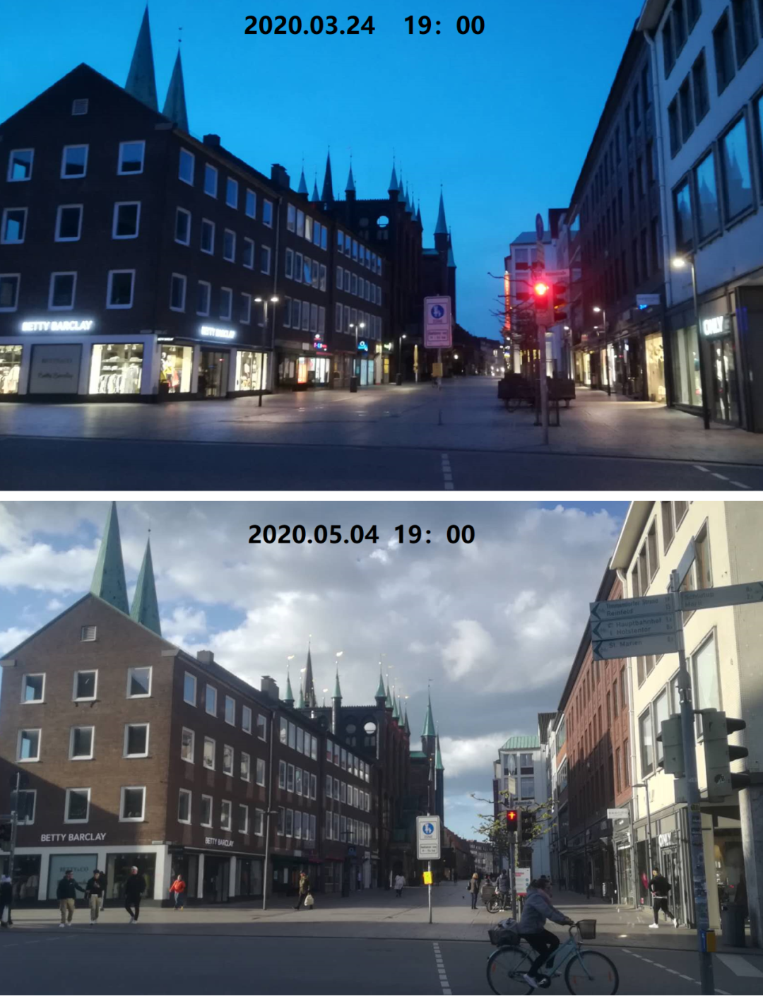 3月24日的市中心与5月4日的市中心。人们的生活秩序已在回归。拍摄:商周