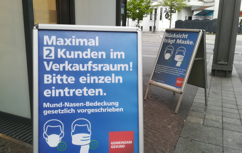 为了防止因逐步解禁而导致疫情再度紧张,德国各州先后出台了 “口罩令”, 规定民众在室内的公共空间,比如超市、公交车、商铺等必须将自己的口鼻遮住。各州在这一口罩令开始实行的时间有点差别,对于违反的处罚的方式也不尽相同。我所在的石荷州市是全德国最晚实行的州,4月29日才开始,而且和其它大多数州不一样,违反 “口罩令” 在这里不用被罚款。