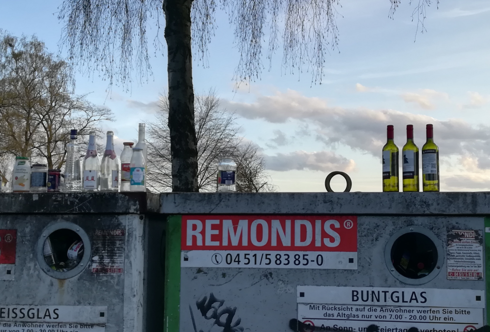 我家附近有个回收玻璃的垃圾桶(在德国玻璃专门回收,不能扔到自家的几种不同的垃圾桶里),之前从来没有满过,但在疫情期间经常满得装不了。葡萄酒瓶放在垃圾桶的盖上,成为疫情期间的一道独特的风景。只是不知道是百姓增加了酒精的消费,还是环卫工人减少了出勤?