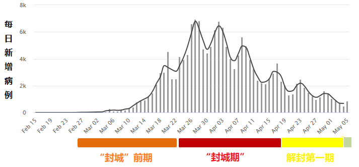 此前的两三天,每日新增病例已经下降到了1000左右。一方面,1000依然是个不小的数字,超过中国湖北之外很多省份的累计病例数。另一方面,因为解封的第一阶段已经实行了一个星期以上,新增病例依然在稳定下降,这无疑是一个积极的信号。