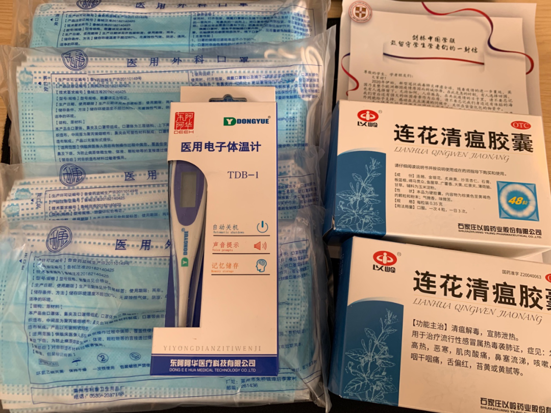 新冠疫情期间,连花清瘟被寄予厚望,被认为对新冠肺炎有效。图为剑桥大学中国留学生收到的健康包。