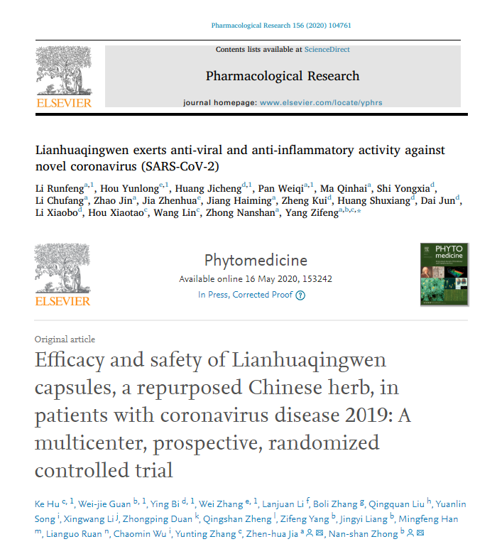 从发表的论文来看,主要是两项工作。第一项是体外实验,也就是曹雪涛综述里给出的那篇参考文献,这篇文章于今年3月在线发表在《Pharmacol. Res.》(《药理学研究》)杂志上 [3] 。而另一项研究是临床试验,检验连花清瘟对新冠肺炎的疗效,这就是上面钟南山和曹雪涛都提到的那项临床研究,这一研究的结果5月16日在《Phytomedicine》(《植物医学》)杂志上在线发表 [4] 。
