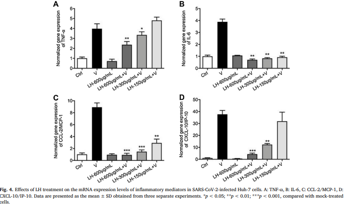 在接下来的第三部分,作者试着检测连花清瘟是否可以抑制由新冠病毒诱导的Huh-7细胞的一些细胞因子和炎性因子基因的表达。