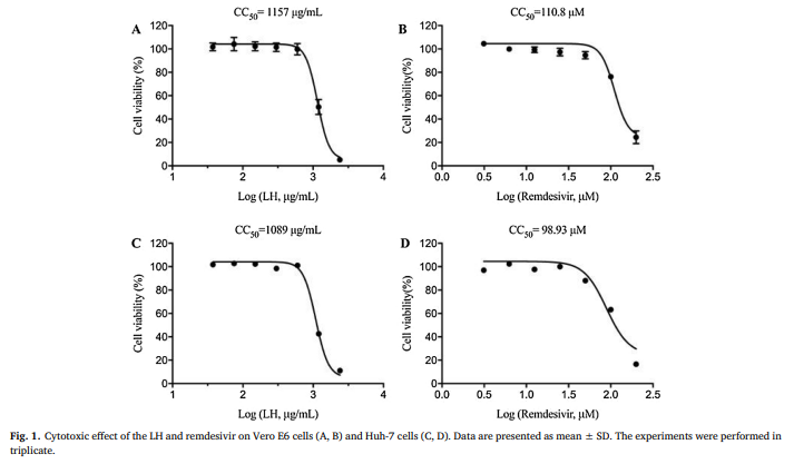 上图就是实验的结果。作者用两个细胞系(Vero E6 和 Huh-7)来做这个实验,除了测试连花清瘟外,还测试了抗病毒药物瑞德西韦(remdeivir)。结果表明,对这两个细胞系,连花清瘟的50%细胞毒性浓度(CC50,也就是能把一半细胞杀死的浓度)大概是 1mg/ml,而瑞德西韦的50% 细胞毒性浓度则为0.1mM(大概相当于60µg/ml)左右。