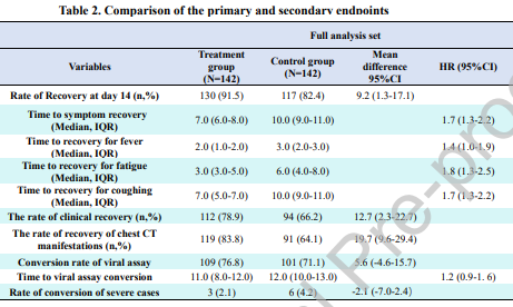 接下来的第二个表是该研究的关键结果,也就是服用了连花清瘟和没有服用连花清瘟的两组病人在病情恢复方面的比较情况。