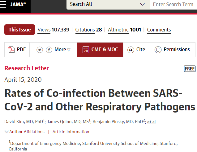 3. David Kim et al. Rates of Co-infection Between SARS-CoV-2 and Other Respiratory Pathogens. JAMA. 2020;323(20):2085-2086.