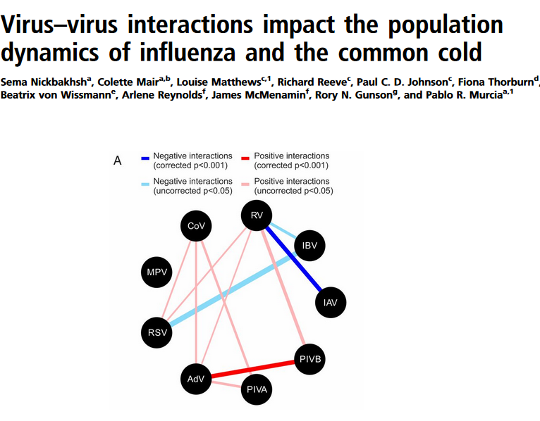 他们发现甲型流感病毒和鼻病毒呈负相关(即人群里如果流感病毒感染率高,那么其中鼻病毒的感染率就低)。但同样在这项研究里,有些病毒之间的关系是呈正相关(即人群里如果一种病毒感染率高,那么另一种病毒的感染率就也高),比如腺病毒和副流感病毒。