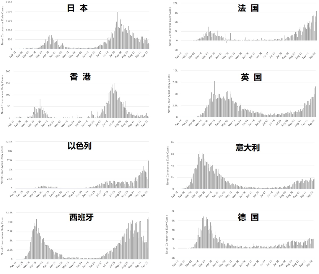 第二波疫情首先在亚洲地区出现。在日本,夏季的这波疫情的确诊人数达到了春季疫情的三倍之多。和日本几乎同时启动第二波疫情的香港,夏季的疫情确诊人数更是达到了春季的四倍。第一波疫情确诊病例只有1.7万的以色列,截至9月25日确诊人数已经超过了21万。