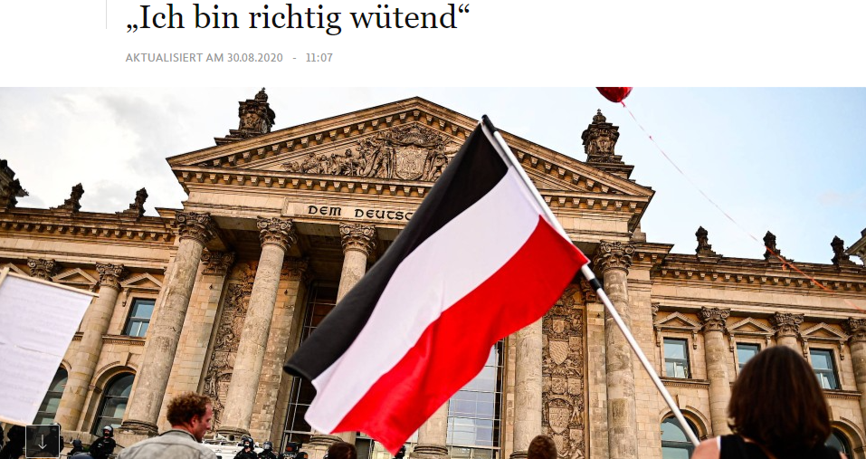 8月30日,一场近两万人参加的游行在柏林举行,但在一个小时后就被警方制止和驱散,理由就是没有保持社交距离。就在这短短的一个小时里,发生了一件绝大多数德国人都不愿意看到的事情:有些极右派示威者将德意志第二帝国黑白红三色旗(后来也被纳粹德国政府使用过)挥舞到了德国议会大楼的门前。