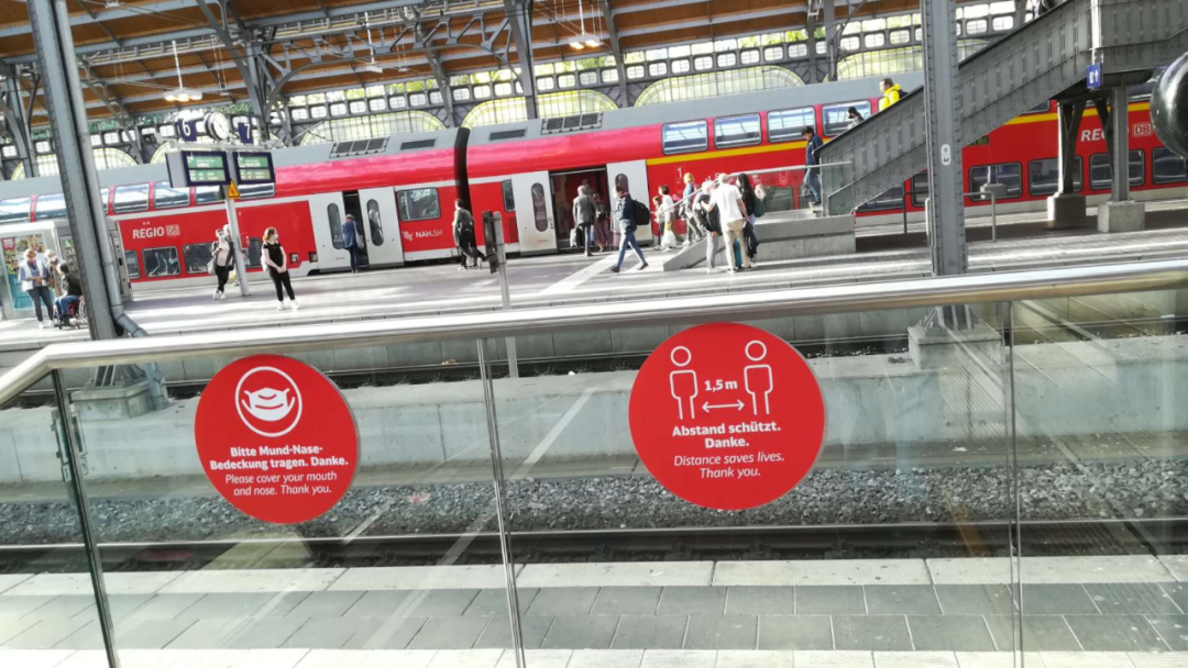 德国火车站里贴出的保持距离和戴口罩的提示(摄影:商周)