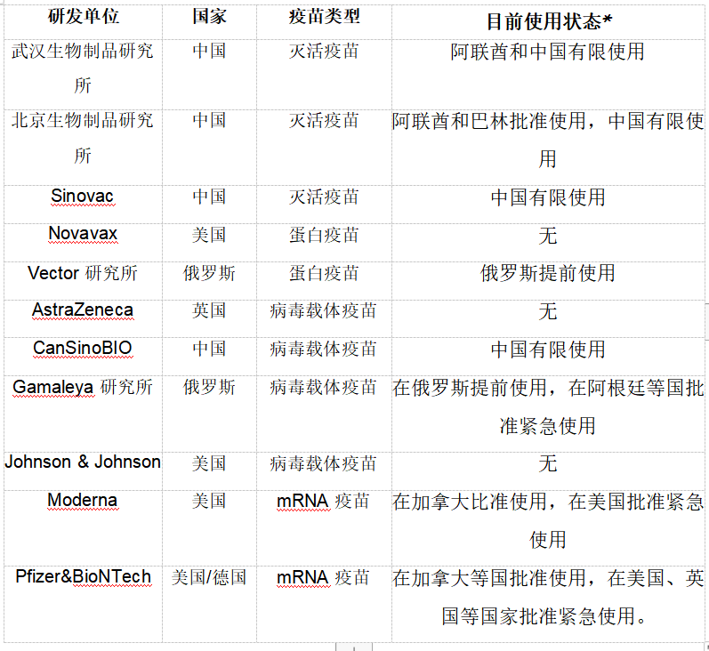 表一:世界上领先的11款新冠疫苗 (数据来源:参考链接9)