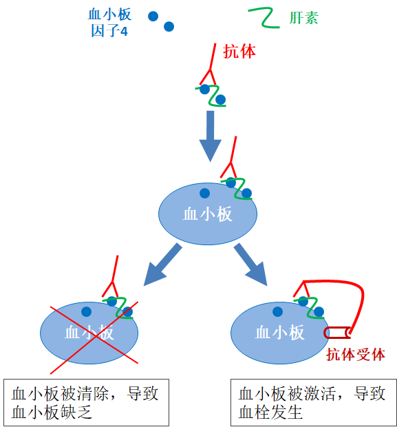 一方面,结合有抗原抗体复合物的血小板会被清除掉,从而导致血小板的缺乏。另一方面,在部分情况下,抗肝素-血小板因子4复合物的抗体可以与血小板表面的抗体受体结合,从而激活血小板,启动凝血反应,导致血栓的发生。