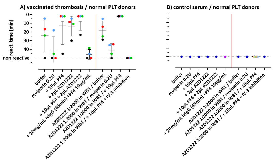 于是他们收集了一些相关病人的血液样本,对这个假设进行验证。3月19日,该团队向媒体公布了他们的发现:在接种疫苗后出现了脑血栓病人里,的确出现了类似抗肝素-血小板因子4复合物的抗体,而这些抗体也的确有激活血小板的功能 [8]。