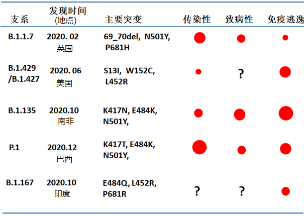 常见的突变新冠病毒支系所带来的效应(作图:商周,信息来源:参考链接2,3,5-10)。红色代表增强,圆圈大小代表增加的强度 (相对带有D614G的B.1支系)。