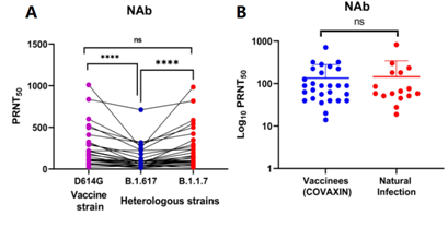 B.1.167突变的免疫逃逸能力的评估(图源:参考链接10)。A: COVAXIN疫苗接种者的血清对野生型新冠病毒(带有D614G突变,用来研发疫苗的支系)、B.1.167、B.1.1.7 的中和情况。B: 新冠自然感染患者的血清以及COVAXIN疫苗接种者血清对B.1.167支系的中和情况。