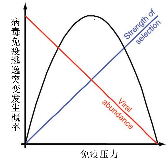 而当免疫压力处于中间位置时,即处于不完全免疫状态,病毒能够部分增殖,从而随机产生免疫逃逸的突变。而并不强的免疫压力又可以作为一种选择力量让这种突变扩散开来。所以,从理论上来说,这种不完全免疫的状态就是免疫逃逸突变的自然选择力量,在免疫逃逸突变发生和流行的过程中发挥了至关重要的作用。